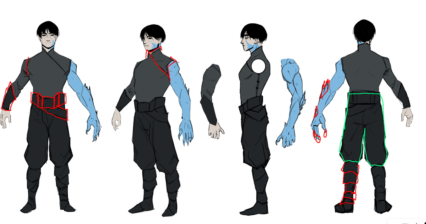The green detail is the silhouette, therefore I’m going to need it to topologies the character correctly, but every red detail is going to be sharp and used to add detail to the overall silhouette.